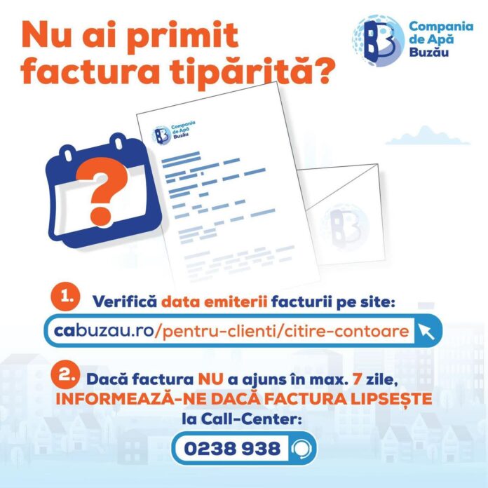 📅 Pentru a verifica data emiterii facturii, consultați programul de citire a contoarelor disponibil pe site: https://www.cabuzau.ro/pentru-clienti/citire-contoare