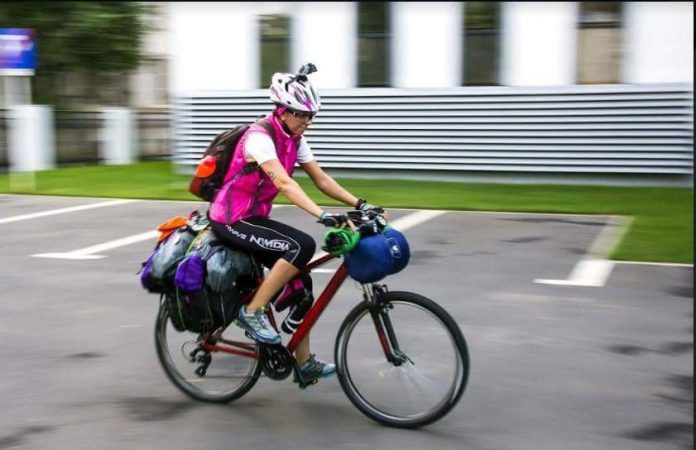 Tânăra îşi transportă pe bicicletă tot bagajul, inclusiv cortul în care va dormi pe parcursul celor 20 de zile, atât cât şi-a propus să dureze expediţia.