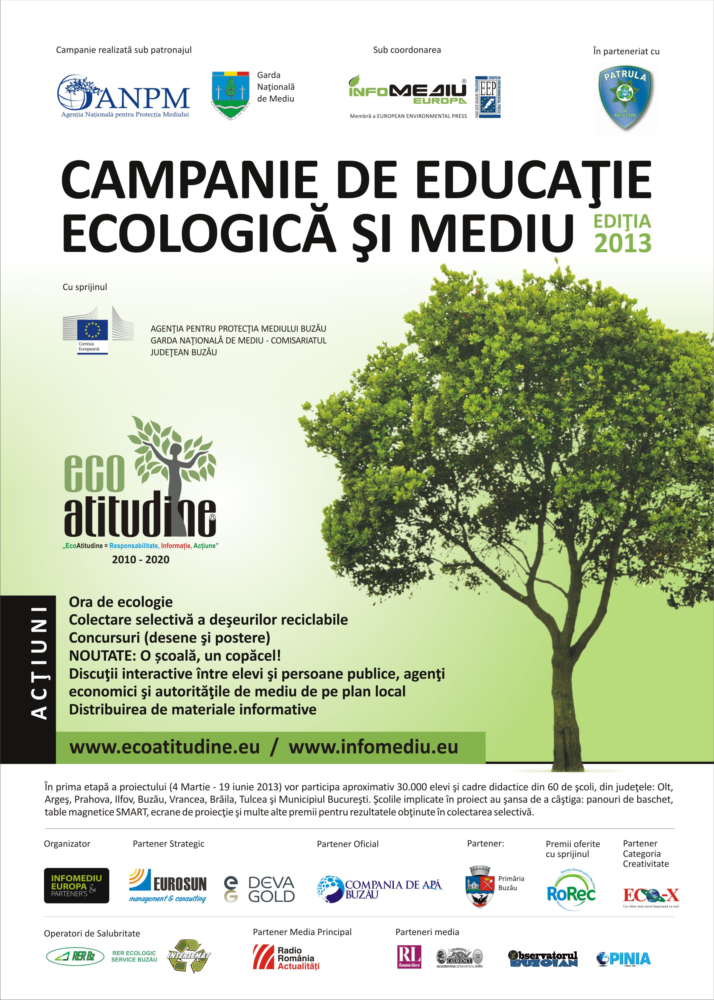 Revista InfoMediu Europa, în parteneriat cu AGENŢIA NAŢIONALĂ PENTRU PROTECŢIA MEDIULUI şi GARDA NAŢIONALĂ DE MEDIU  va organiza festivitatea de premiere în cadrul proiectului „EcoAtitudine = Responsabilitate, Informaţie, Acţiune” – Campanie de Educaţie Ecologică şi Mediu – Ediţia 2013, Etapa I, pentru județul Buzău.
