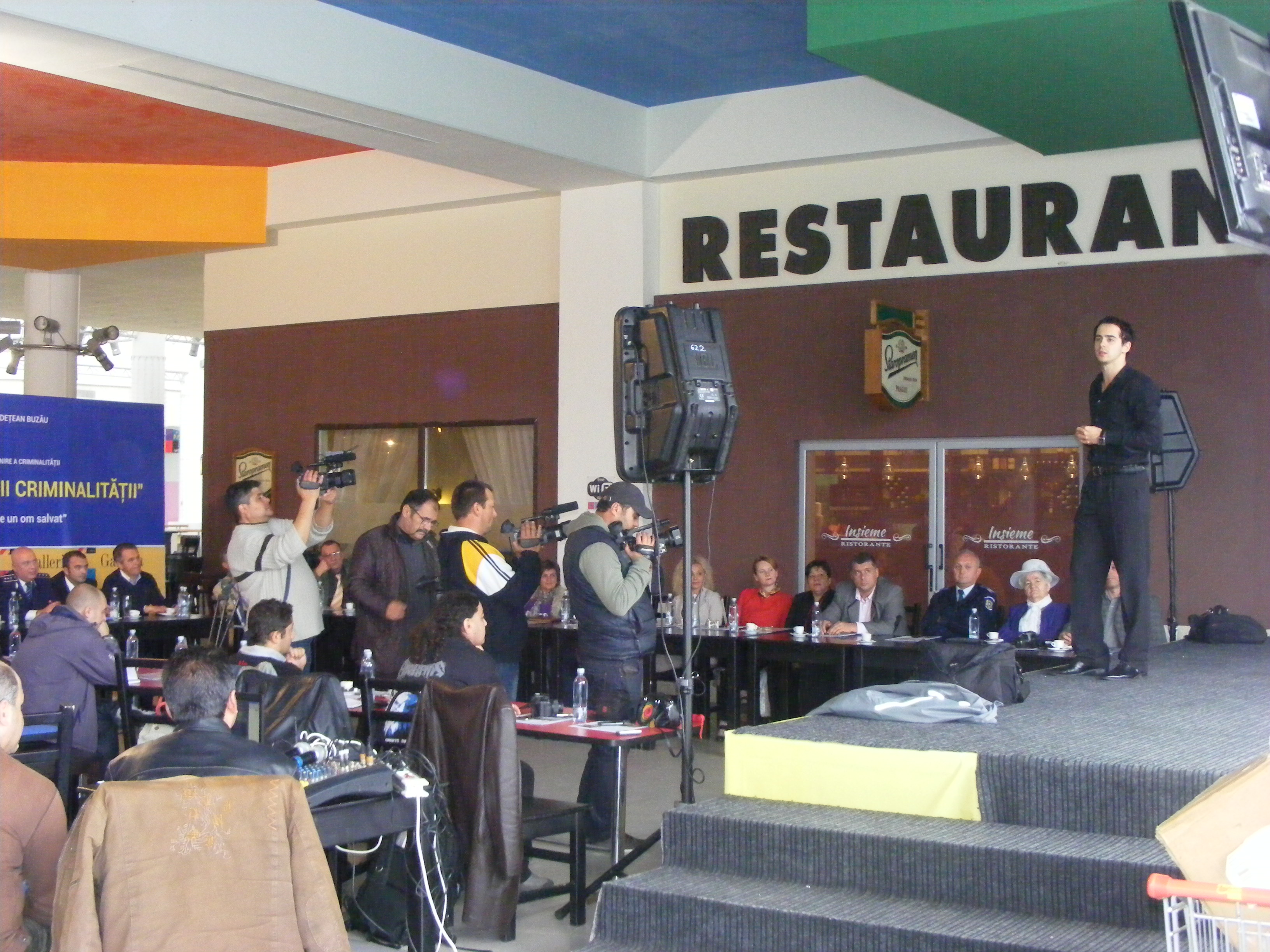 Pentru a ajunge mai uşor în atenţia buzoienilor, poliţiştii au organizat o conferinţă la Galeria Mall. Aici patru actori au urcat pe scenă unde au dat viaţă unor personaje certate cu legea.