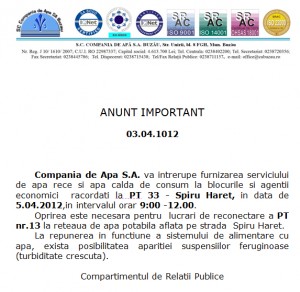 Compania de Apa, lucrariCompania de Apa S.A. va intrerupe furnizarea serviciului de apa rece si apa calda de consum la blocurile si agentii economici  racordati la PT 33 – Spiru Haret, in data de 5.04.2012,in intervalul orar 9:00 -12.00.