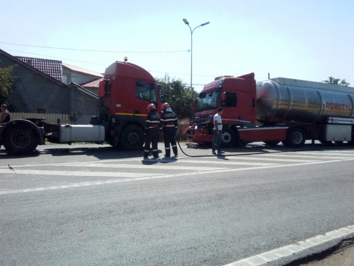 Şoferul cisternei a fost rănit în urma coliziunii şi a fost transportat la spital.