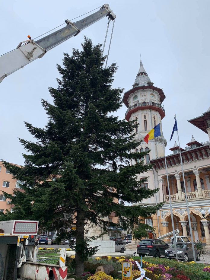Bradul de Crăciun a ajuns în Piața Dacia. Arborele măsoară circa 20 de metri, are aproximativ 50 de ani și a fost donat municipalității de o familie de buzoieni de pe strada Traian Vuia.