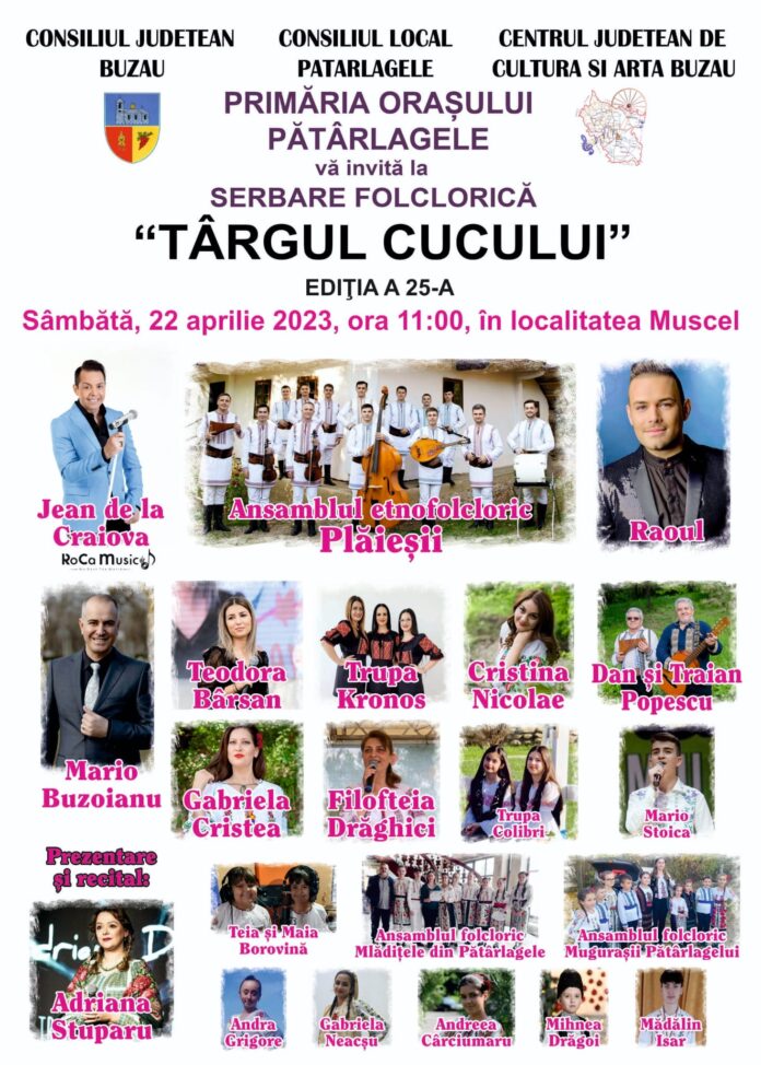 Vă aștept cu zâmbet și voie bună, sâmbătă, 22 aprilie 2023, începând cu ora 11:00, la Serbarea Folclorică „Târgul Cucului”, ediția a XXV-a, ce va avea loc în satul Mușcel.