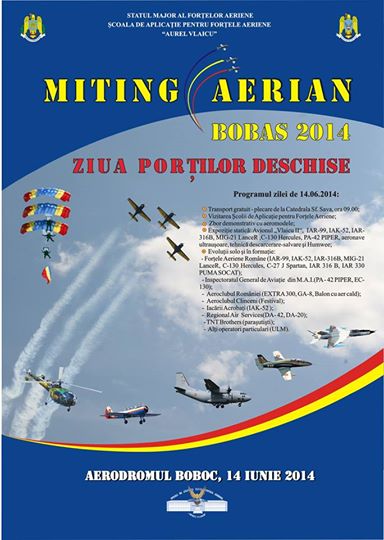 În data de 14 iunie 2014, începand cu ora 10.00, la verticala aerodromului vor putea fi urmărite evoluţii cu aeronave aparţinând Forţelor Aeriene Române (MiG 21 LANCER, C-27J SPARTAN, C-130 HERCULES, IAR-330, IAR-99, IAR-316B, YAK-52) iar piloţii militari vor fi acompaniaţi de aşii acrobaţi şi paraşutiştii de la Aeroclubul României, Iacării Acrobaţi, Regional Air Services şi TNT Brothers.