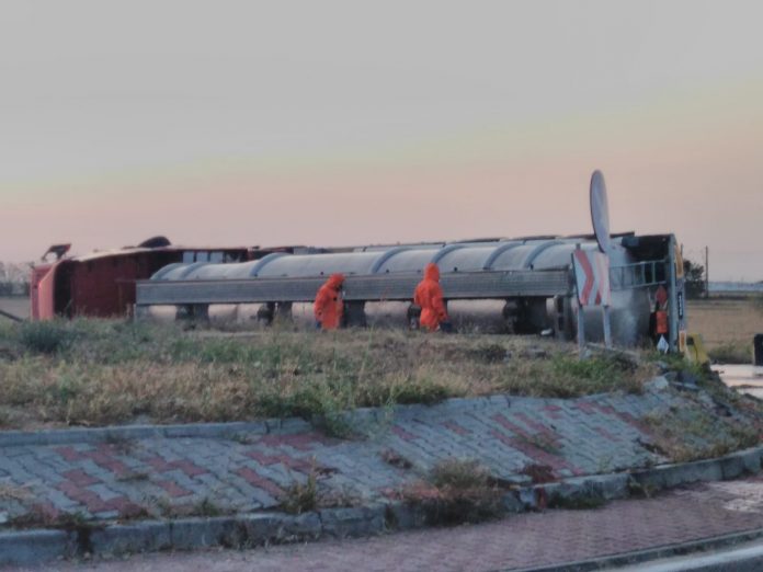 Centrul INFOTRAFIC din Inspectoratul General al Poliției Române informează că la intersecția dintre DN2 cu DN1B, la kilometrul 104+700 de metri, în zona municipiului Buzău, județul Buzău, o cisternă încărcată cu 24 de tone de substanță volatilă a pătruns în sensul giratoriu și s-a răsturnat. Nu au rezultat persoane rănite, însă sunt scurgeri pe carosabil, fiind risc ridicat de explozie. Traficul rutier este întrerupt pentru a permite intervenția echipajelor specializate.
