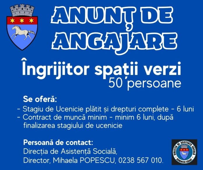 Primăria municipiului Râmnicu Sărat, prin intermediul Direcției de Asistență Socială, vine cu o oportunitate de angajare pentru 50 de persoane dornice să lucreze ca îngrijitori spații verzi, pe o perioadă de cel puțin șase luni, grație unui proiect prin fonduri europene derulat de administrația locală. În plus, beneficiarii vor fi plătiți și pentru stagiul de ucenicie programat prin același proiect.