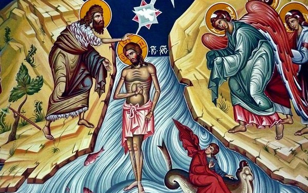 Cand Mantuitorul a aparut pe malul Iordanului, Sfantul Ioan Botezatorul, luminat de Duhul Sfant, l-a recunoscut si l-a aratat multimilor. Momentul in care Mantuitorul Iisus Hristos a primit botezul este consemnat de toti cei patru evanghelisti.