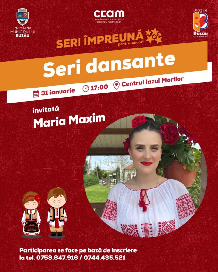 Primăria municipiului Buzău și Centrul Cultural și Educațional „Alexandru Marghiloman” Buzău îi invită pe seniorii buzoieni să petreacă o seară frumoasă cu dans, muzică și voie bună alături de îndrăgita solistă de muzică populară Maria Maxim.