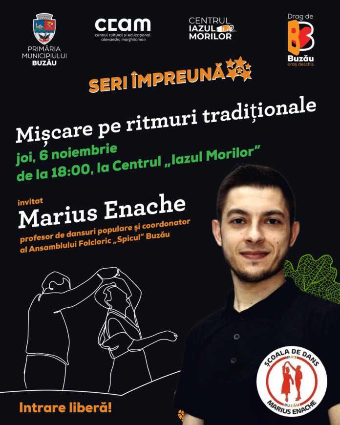 Joi, de la ora 18:00, la Centrul ,,Iazul Morilor”, va fi organizată o seară de dans pe ritmuri tradiționale, alături de tânărul profesor de dansuri populare Marius Enache.