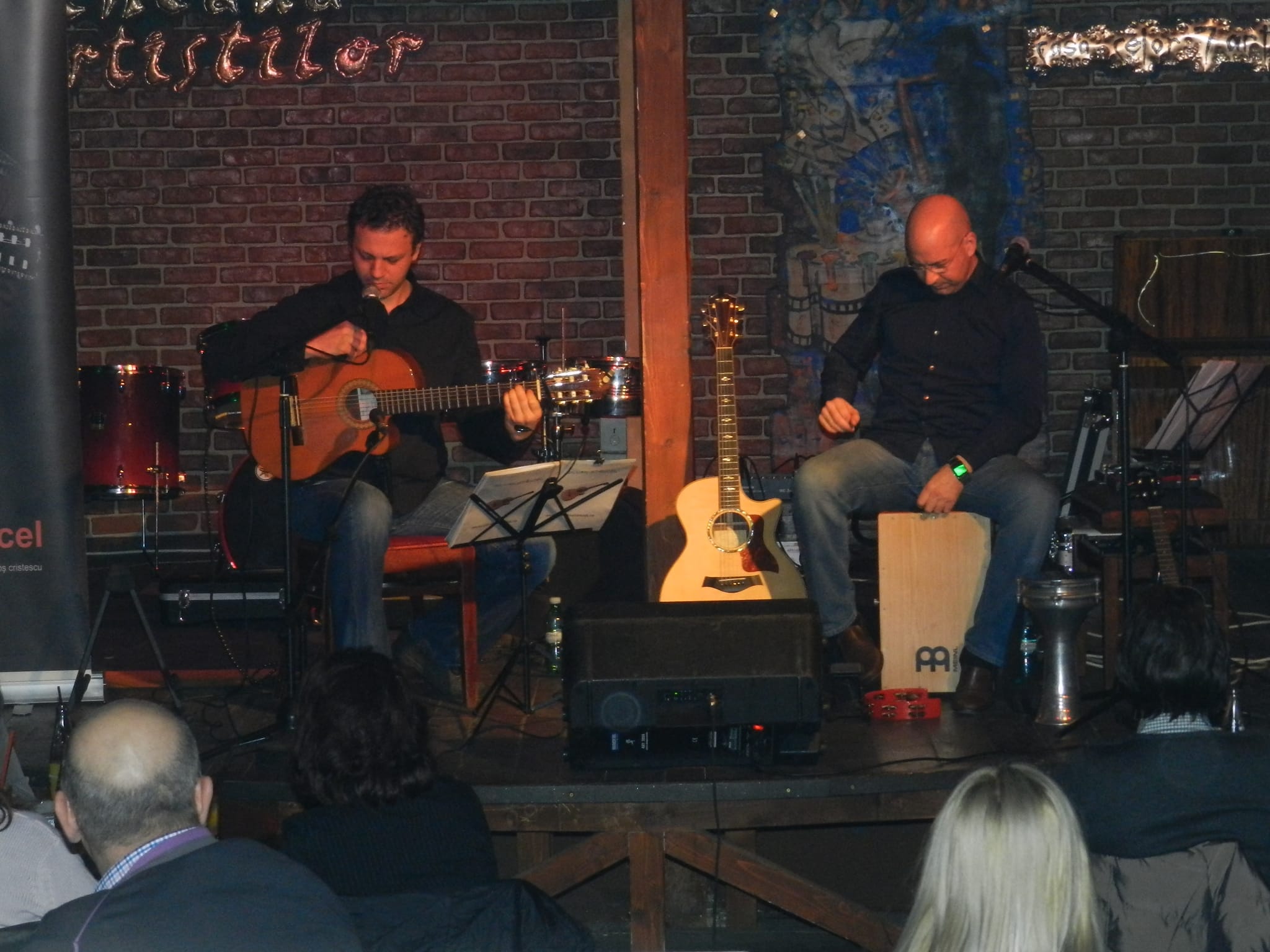 Două chitare clasice , elemente de percuţie din cele mai diverse, muzicuţe,ceva confesiuni în pauzele dintre cîntece şi multă originalitate. Acestea au fost atuurile pe care cei doi artişti le-au pus la bătaie pentru a-i ţine în Cafeneaua Artiştilor pe cei 60-70 de spectatori. Duo-ul , tot mai cunoscut în lumea muzicală autohtonă a revenit aseară în urbea noastră pentru o „cîntare” care face parte dintr-un turneu dedicat femeii , intitulat „Pentru ea”.
