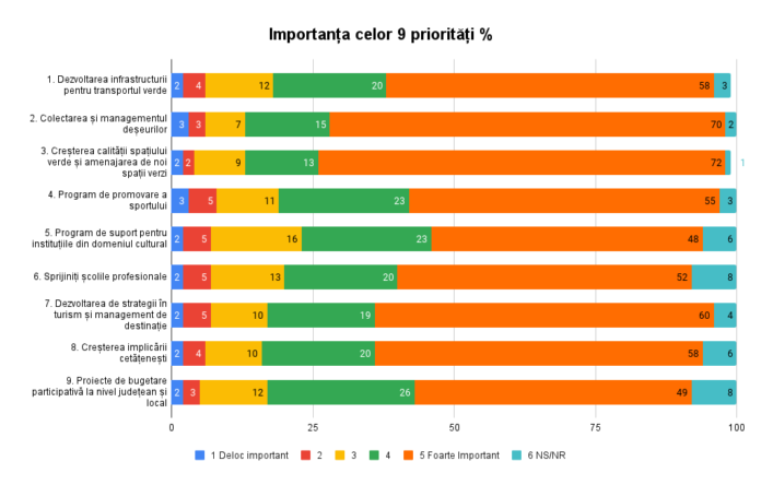- 72% dintre respondenți au prioritizat categoria Creșterea calității spațiului verde și amenajarea de noi spații verzi ca fiind cea mai importantă pentru ei;