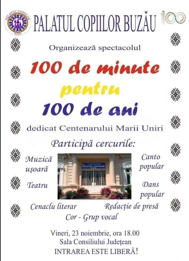 Vineri, 23 noiembrie, începând cu ora 18.00, Sala Consiliului Judeţean Buzău va găzdui un spectacol dedicat marelui eveniment, Centenarul Marii Uniri. Elevii cercurilor de profil din cadrul Palatului Copiilor Buzău vor prezenta momente artistice speciale ce reflectă iubirea pentru ţară, mândria de a fi român, spiritul românesc.