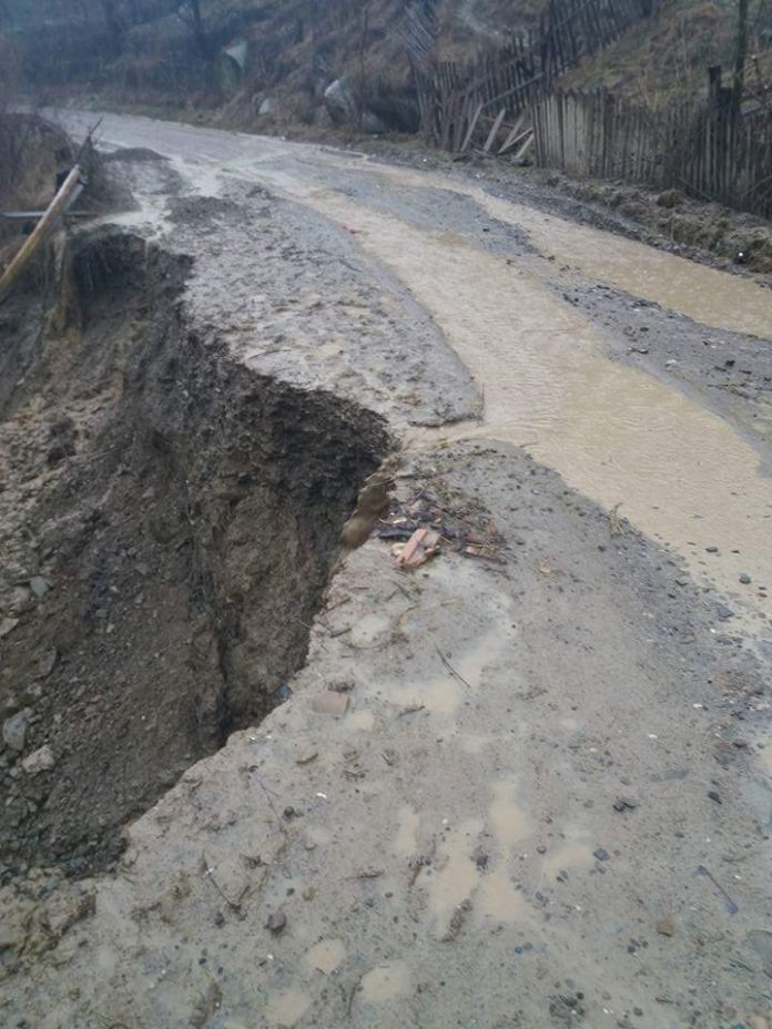 Ploile din ultimile zile si apa scursa de pe versanti au inmuiat pamantul, iar o bucata buna din drum s-a desprins deja si a luat-o la vale.