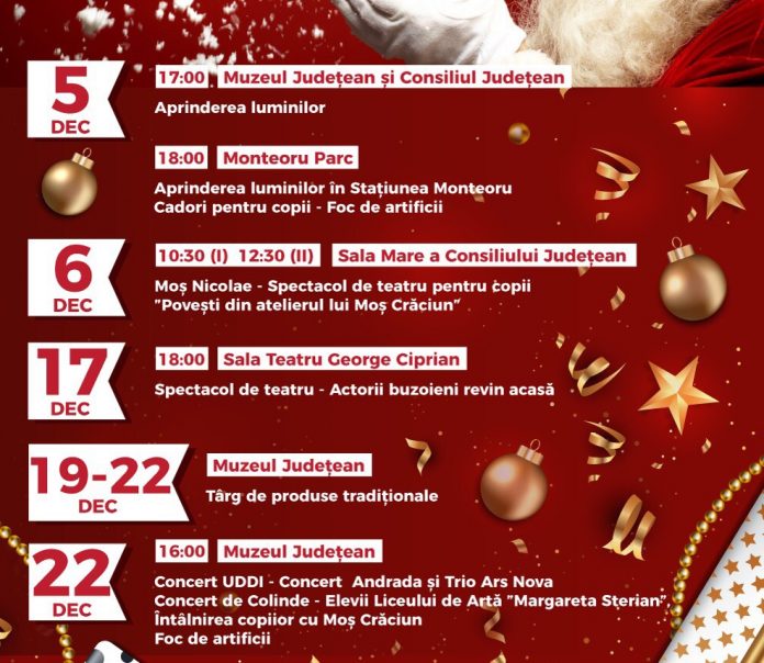 Consiliul Judeţean Buzău a pregătit un program încărcat de manifestări cu ocazia sărbătorilor de iarnă. Pe 1 decembrie, buzoienii se vor putea bucura de o masă tradiţională (3000 de porții) și de un spectacol susținut de UDDI și artiștii Centrului Județean de Cultură și Artă Buzău. Acest eveniment va avea loc în Parcul Crâng, începând cu ora 11.30.