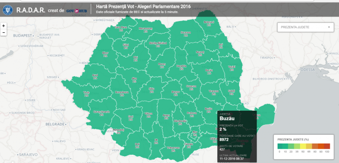 GovITHub a lansat platforma online Hartă Prezență Vot – Alegeri Parlamentare 2016, disponibilă la adresa http://radar.ithub.gov.ro/ și accesibilă în condiții optime în vizualizare tip desktop, site destinat monitorizării în timp real a prezenței la vot în cadrul alegerilor parlamentare din 11 decembrie. Site-ul oferă date în timp real privind prezența la vot atât din secțiile de vot de pe teritoriul României, cât și cele din afara țării.