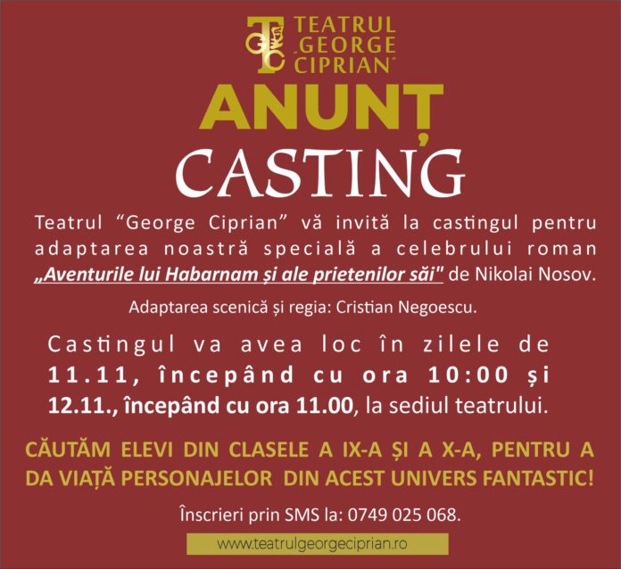 Sunteți pasionați de teatru și doriți să vă alăturați unei producții captivante? Teatrul “George Ciprian” vă invită la castingul pentru adaptarea noastră specială a celebrului roman „Aventurile lui Habarnam și ale prietenilor săi” de Nikolai Nosov, în adaptarea scenică și regia lui Cristian Negoescu.