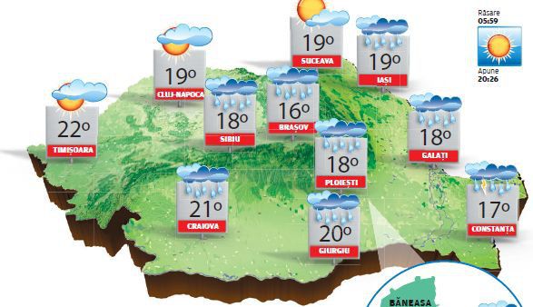 Cerul va fi temporar noros şi va ploua în majoritatea regiunilor în averse, însoţite de descărcări electrice și posibile căderi de grindină. Vântul va fi slab şi moderat cu unele intensificări, în prima parte a intervalului, în estul, sud-estul şi centrul teritoriului, la munte, dar trecător şi în celelalte regiuni, în timpul ploilor. În Capitală, temperaturile vor fi uşor mai scăzute decât cele specifice perioadei, cu valori cuprinse între 8 și 19 grade Celsius. Cerul va fi variabil cu ușoare înnorări și temporar se vor semnala averse, posibil şi descărcări electrice.