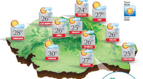 Vremea se va mentine în general instabila în sud-estul tarii si la munte, unde pe parcursul zilei vor mai fi averse, descarcari electrice si posibil intensificari de scurta durata ale vântului. Izolat, cantitatile de apa vor mai depasi 20-25 l/mp si vor fi conditii de grindina.