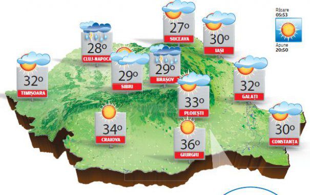 Temperaturile vor fi cuprinse între 13 şi 36 de grade Celsius, mai scăzute în depresiunile din estul Transilvaniei. Vor fi înnorări trecătoare, averse, descărcări electrice şi intensificări de scurtă durată ale vântului, local, în zona montană şi doar izolat în vestul, nord-vestul şi centrul ţării. În rest, cerul va fi variabil. În Capitală, vremea va fi călduroasă, iar disconfortul termic va creşte. Temperaturile vor fi cuprinse între 19 și 34 de grade Celsius. Cerul va fi mai mult senin, iar vântul va sufla slab, până la moderat.